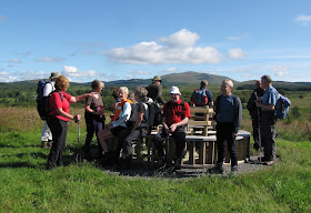 It's a glorious day as we continue upwards.Our walk of a few weeks ago is brought to mind with Larg Hill standing prominently ahead of us.The sky is streaked with wispy white clouds and the views are wonderful.